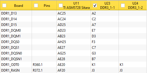 New in ConnTrace 2.0 is the Netlist view. This view shows all signals defined in a netlist in a tabular manner, with the connected pins, for one board or multiple boards. You can add any number of components to the view to easily see how they connect to each other. When present in the PCB netlist file ConnTrace will show pin labels, like DDR3_A1 instead of just the pin number (AE3). Check boxes in the header in combination with sorting and name filtering allow you to concentrate on areas of interest.