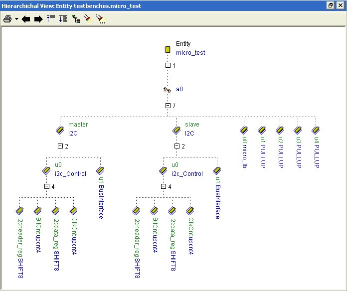 Below is an example of the hierarchy for an I2C model with testbench displayed in the 2 modes.