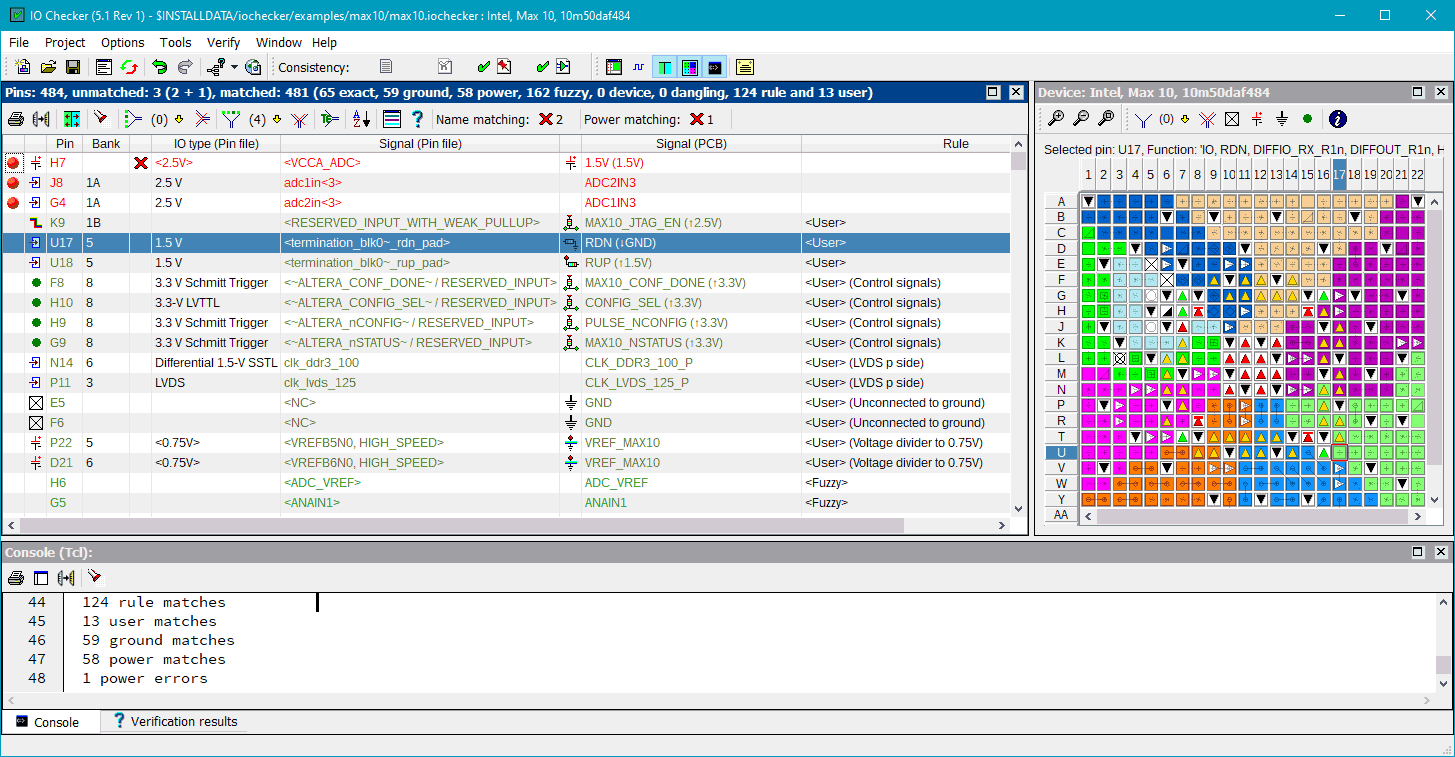 IO Checker uses rules (based on regular expressions) to match the signal names in both the FPGA and PCB design environment. It allows the tool to validate groups of matches although individual signals can still differ. The rules can be generated automatically and be fine-tuned by the designer. The automated approach will often match 80% to 90% of all device pins.